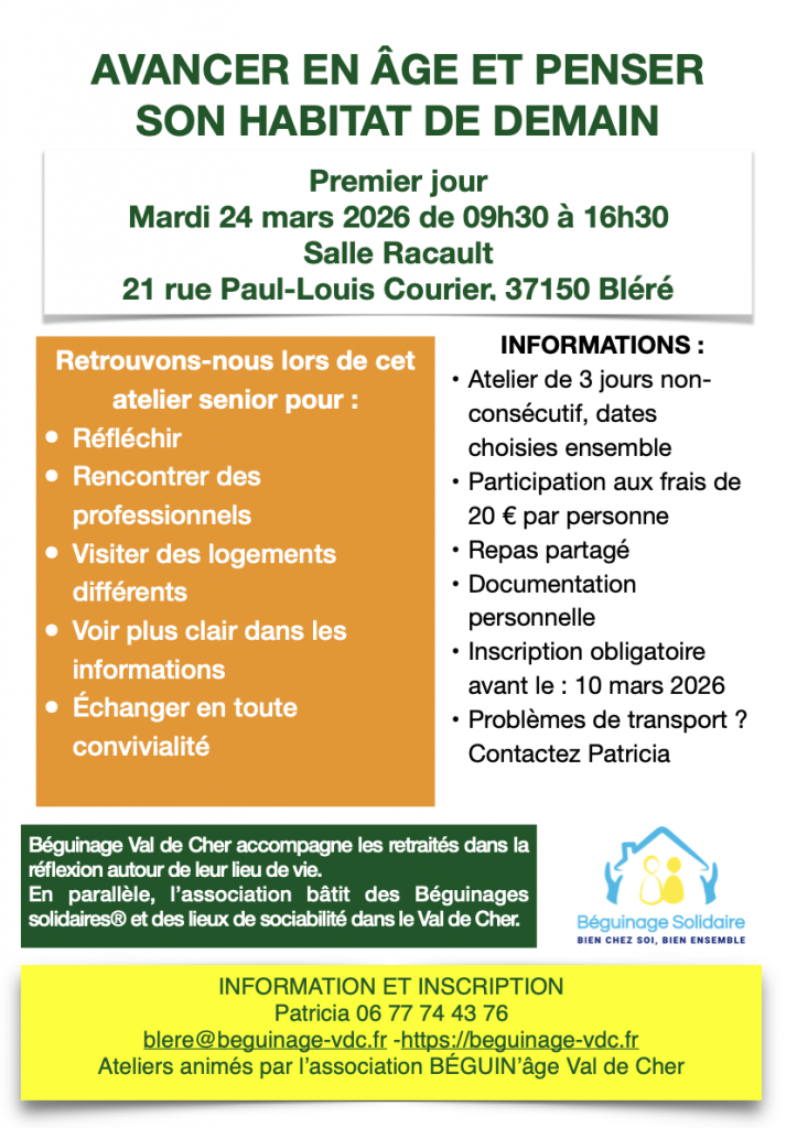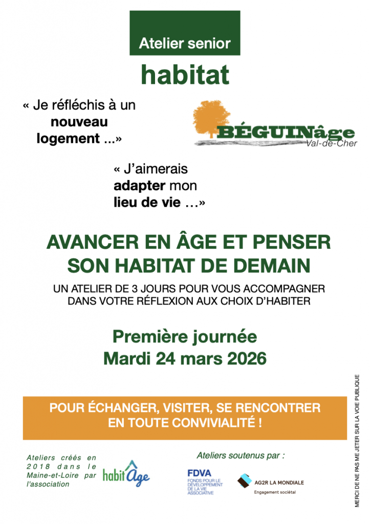 Grâce au partenariat entre les associations BEGUIN’âge Val de Cher et Habit’âge, nous sommes maintenant en mesure de proposer aux ainés du Val de Cher et de Touraine un parcours d’accompagnement collectif sur 3 jours non-consécutifs pour PENSER SON HABITAT, exercer son CHOIX D’HABITER en toute autonomie.