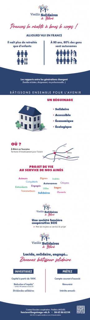 Nous créons une Société coopérative d’intêret collectif (SCIC- SAS) pour concrétiser le projet de l’association Béguin’âge Val de Cher à Bléré en partenariat avec le groupe associatif national Béguinage Solidaire ®.
